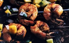 Pour 10 grams of salt and 900 grams of big shrimps with tails, and marinate them at room temperatures for 30 minutes. Put 5g ground cumin, 1 diced unripe fresh mango, 180g diced cucumber, 8g diced jalapeno, 60ml of lemon juice, 54g minced mint leaves and 54g coriander, and then mix them. Fry the shrimps and mix them with fresh mango chutney.