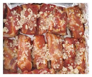 2. Put tinfoil on the baking tray with marinated ribs on it. Put 10g of oil in the remaining 1/3 of garlic and pour it evenly on the ribs. Seal with tinfoil and bake in the oven at 230℃ for 25 minutes.